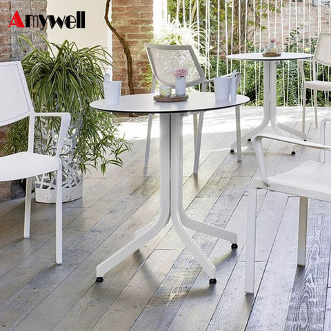 Gran oferta, mesa de comedor redonda, hoja de Panel Hpl, mesa de jardín, muebles de exterior, Hpl, compacto, plegable